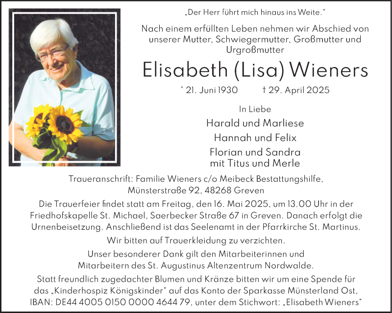 Hier finden Sie alle Traueranzeigen aus der Zeitung, die bisher für Elisabeth Wieners erschienen sind. Weitere Traueranzeigen, die in der Zeitung erscheinen, werden hier ebenfalls aufgelistet