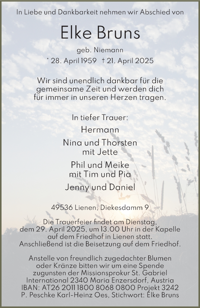 Hier finden Sie alle Traueranzeigen aus der Zeitung, die bisher für Elke Bruns erschienen sind. Weitere Traueranzeigen, die in der Zeitung erscheinen, werden hier ebenfalls aufgelistet
