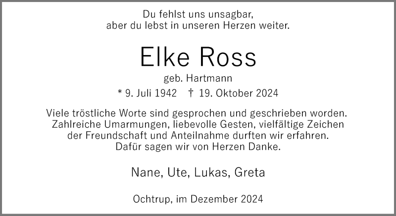 Hier finden Sie alle Traueranzeigen aus der Zeitung, die bisher für Elke Ross erschienen sind. Weitere Traueranzeigen, die in der Zeitung erscheinen, werden hier ebenfalls aufgelistet