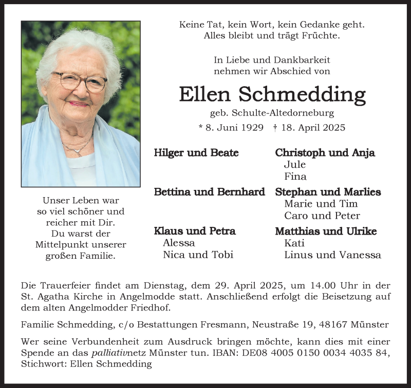 Hier finden Sie alle Traueranzeigen aus der Zeitung, die bisher für Ellen Schmedding erschienen sind. Weitere Traueranzeigen, die in der Zeitung erscheinen, werden hier ebenfalls aufgelistet