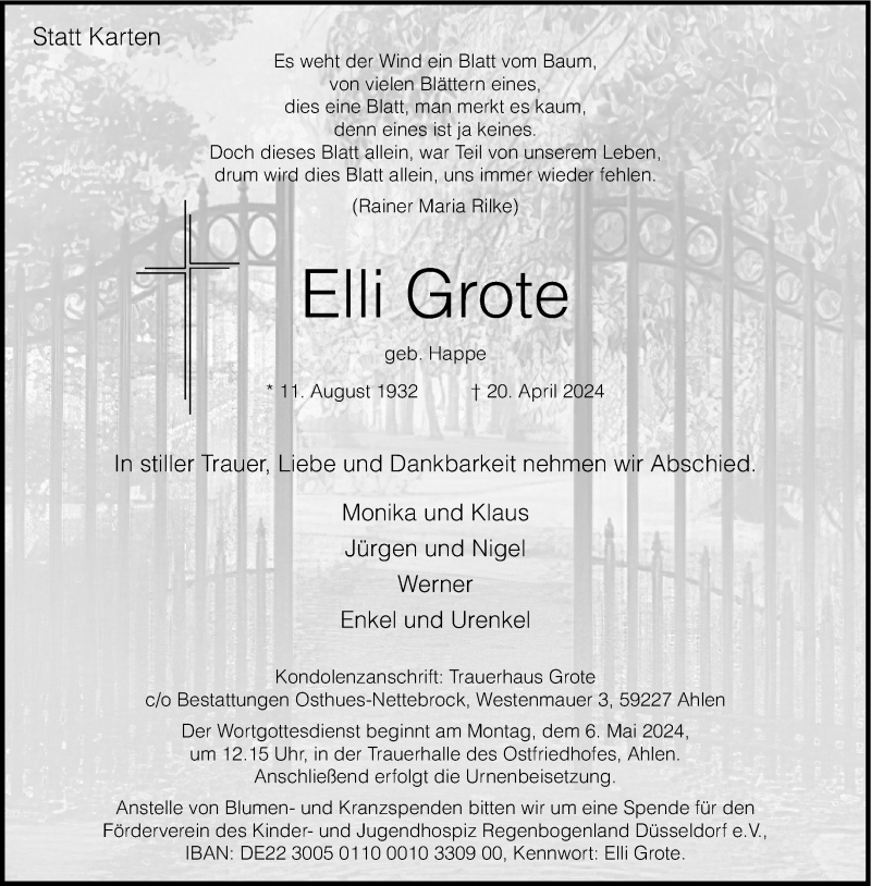 Hier finden Sie alle Traueranzeigen aus der Zeitung, die bisher für Elli Grote erschienen sind. Weitere Traueranzeigen, die in der Zeitung erscheinen, werden hier ebenfalls aufgelistet