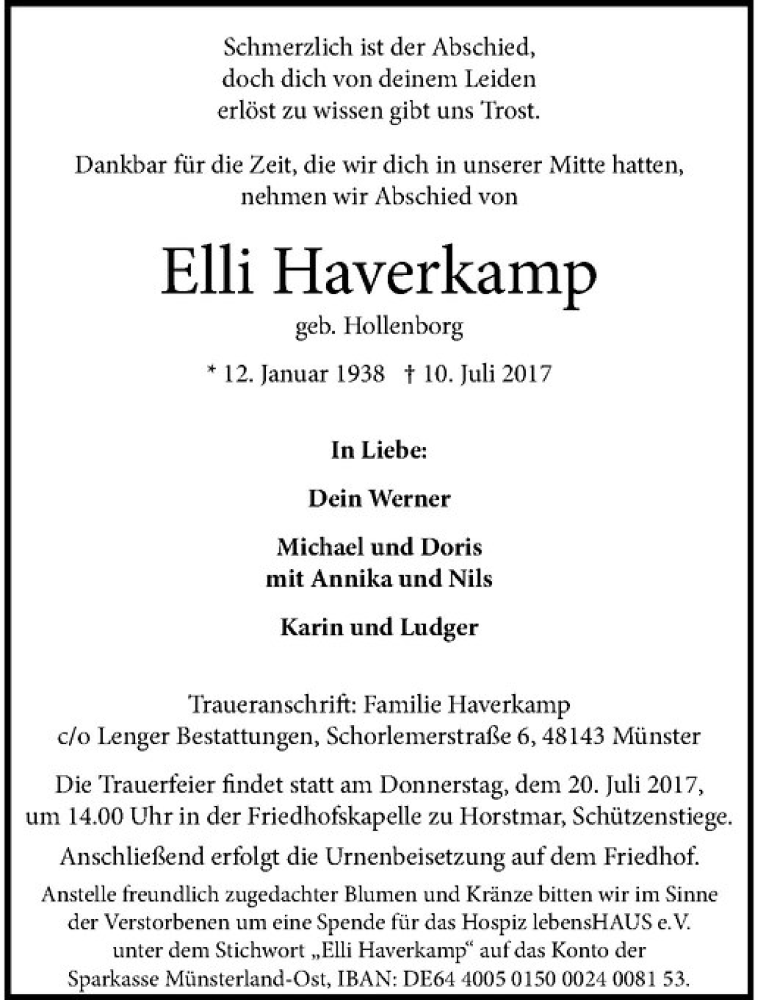 Hier finden Sie alle Traueranzeigen aus der Zeitung, die bisher für Elli Haverkamp erschienen sind. Weitere Traueranzeigen, die in der Zeitung erscheinen, werden hier ebenfalls aufgelistet