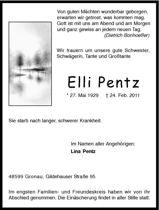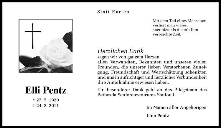 Hier finden Sie alle Traueranzeigen aus der Zeitung, die bisher für Elli Pentz erschienen sind. Weitere Traueranzeigen, die in der Zeitung erscheinen, werden hier ebenfalls aufgelistet