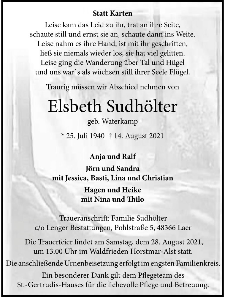 Hier finden Sie alle Traueranzeigen aus der Zeitung, die bisher für Elsbeth Sudhölter erschienen sind. Weitere Traueranzeigen, die in der Zeitung erscheinen, werden hier ebenfalls aufgelistet