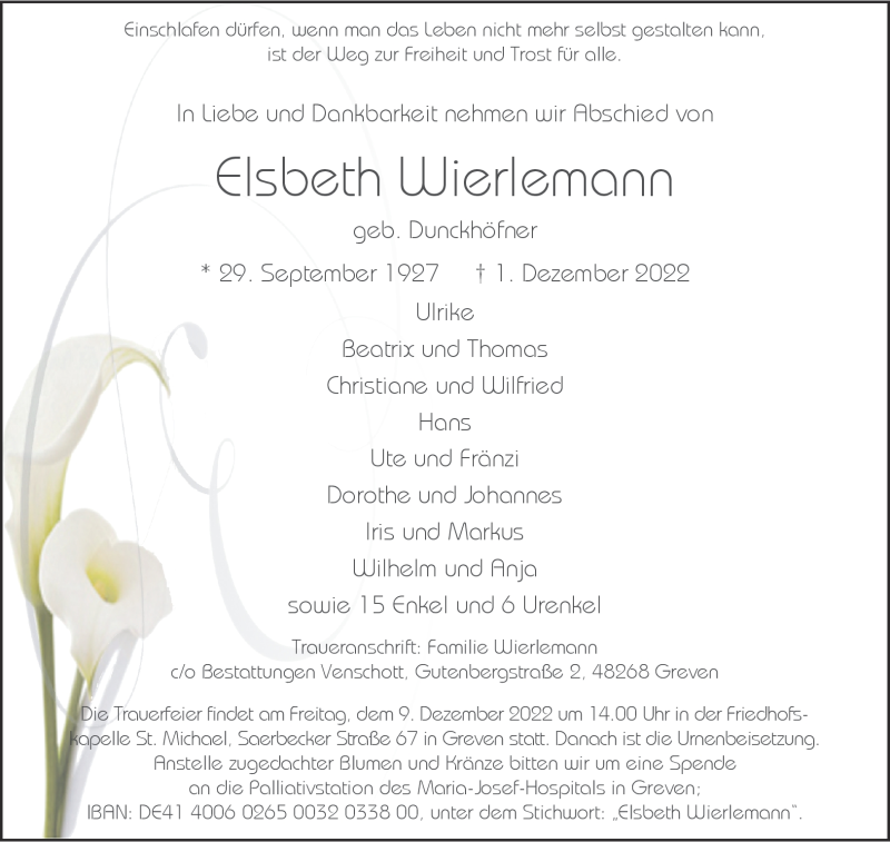 Hier finden Sie alle Traueranzeigen aus der Zeitung, die bisher für Elsbeth Wierlemann erschienen sind. Weitere Traueranzeigen, die in der Zeitung erscheinen, werden hier ebenfalls aufgelistet