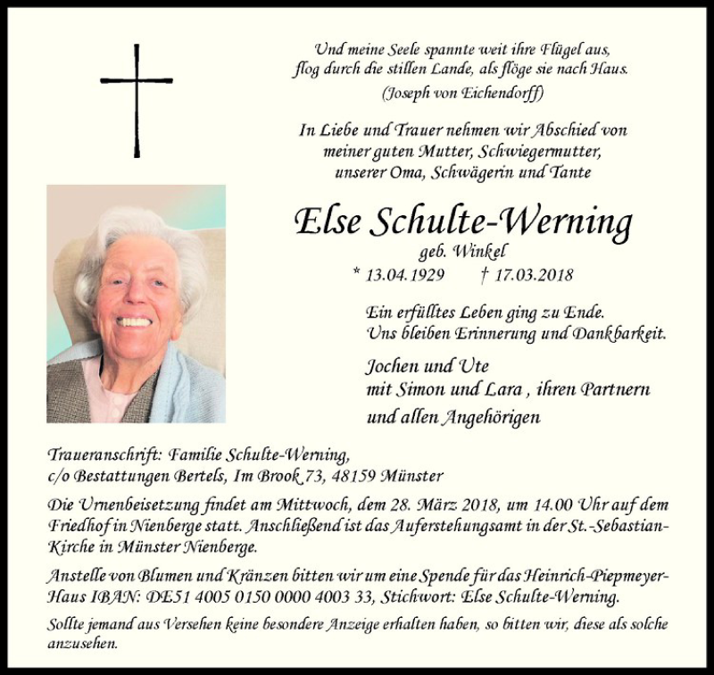 Hier finden Sie alle Traueranzeigen aus der Zeitung, die bisher für Else Schulte-Werning erschienen sind. Weitere Traueranzeigen, die in der Zeitung erscheinen, werden hier ebenfalls aufgelistet