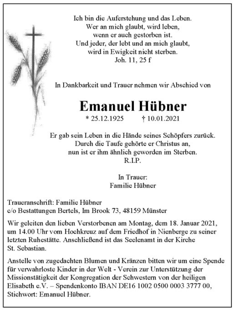 Hier finden Sie alle Traueranzeigen aus der Zeitung, die bisher für Emanuel Hübner erschienen sind. Weitere Traueranzeigen, die in der Zeitung erscheinen, werden hier ebenfalls aufgelistet