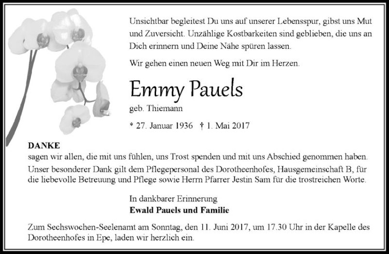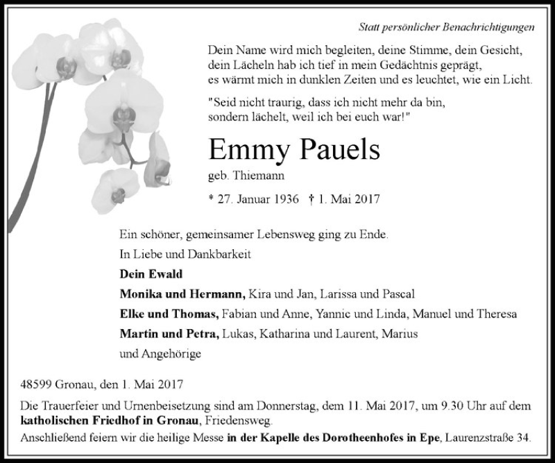 Hier finden Sie alle Traueranzeigen aus der Zeitung, die bisher für Emmy Pauels erschienen sind. Weitere Traueranzeigen, die in der Zeitung erscheinen, werden hier ebenfalls aufgelistet