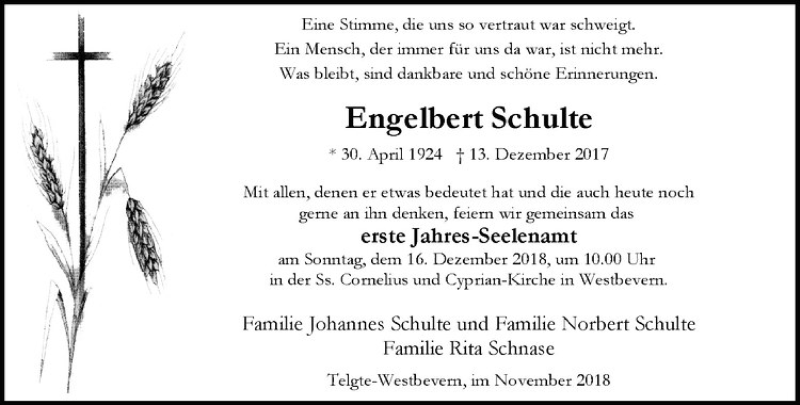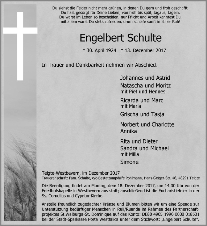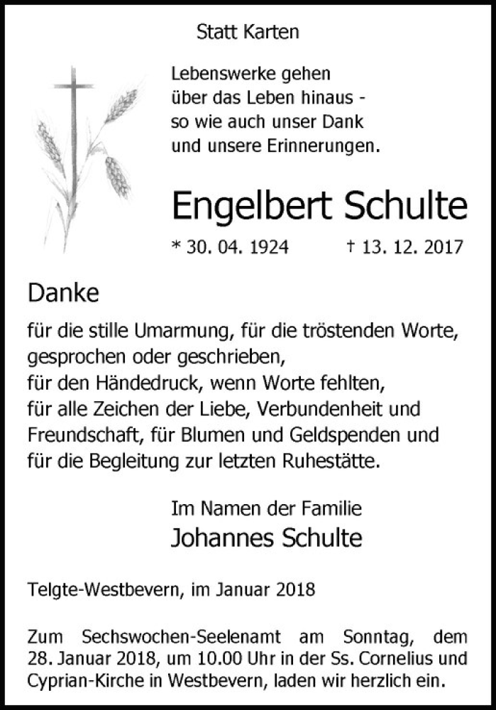 Hier finden Sie alle Traueranzeigen aus der Zeitung, die bisher für Engelbert Schulte erschienen sind. Weitere Traueranzeigen, die in der Zeitung erscheinen, werden hier ebenfalls aufgelistet