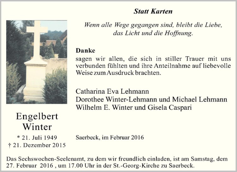 Hier finden Sie alle Traueranzeigen aus der Zeitung, die bisher für Engelbert Winter erschienen sind. Weitere Traueranzeigen, die in der Zeitung erscheinen, werden hier ebenfalls aufgelistet