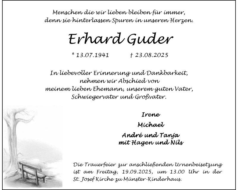 Hier finden Sie alle Traueranzeigen aus der Zeitung, die bisher für Erhard Guder erschienen sind. Weitere Traueranzeigen, die in der Zeitung erscheinen, werden hier ebenfalls aufgelistet