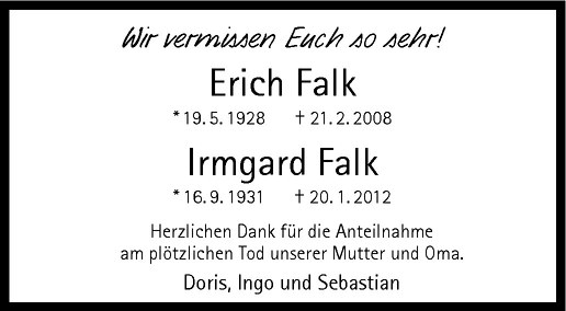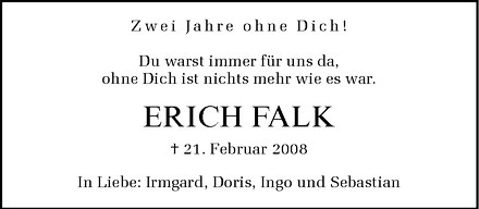Hier finden Sie alle Traueranzeigen aus der Zeitung, die bisher für Erich Falk erschienen sind. Weitere Traueranzeigen, die in der Zeitung erscheinen, werden hier ebenfalls aufgelistet