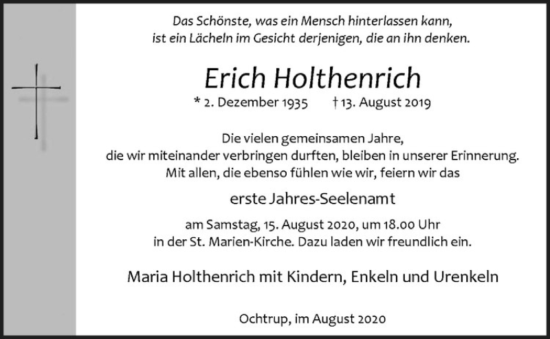 Hier finden Sie alle Traueranzeigen aus der Zeitung, die bisher für Erich Holthenrich erschienen sind. Weitere Traueranzeigen, die in der Zeitung erscheinen, werden hier ebenfalls aufgelistet