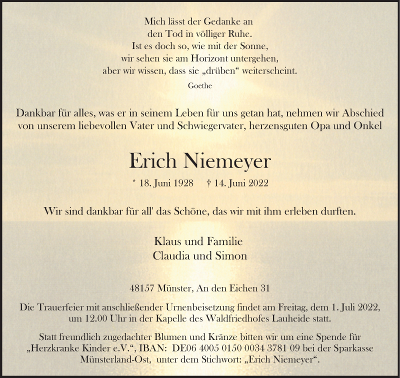 Hier finden Sie alle Traueranzeigen aus der Zeitung, die bisher für Erich Niemeyer erschienen sind. Weitere Traueranzeigen, die in der Zeitung erscheinen, werden hier ebenfalls aufgelistet
