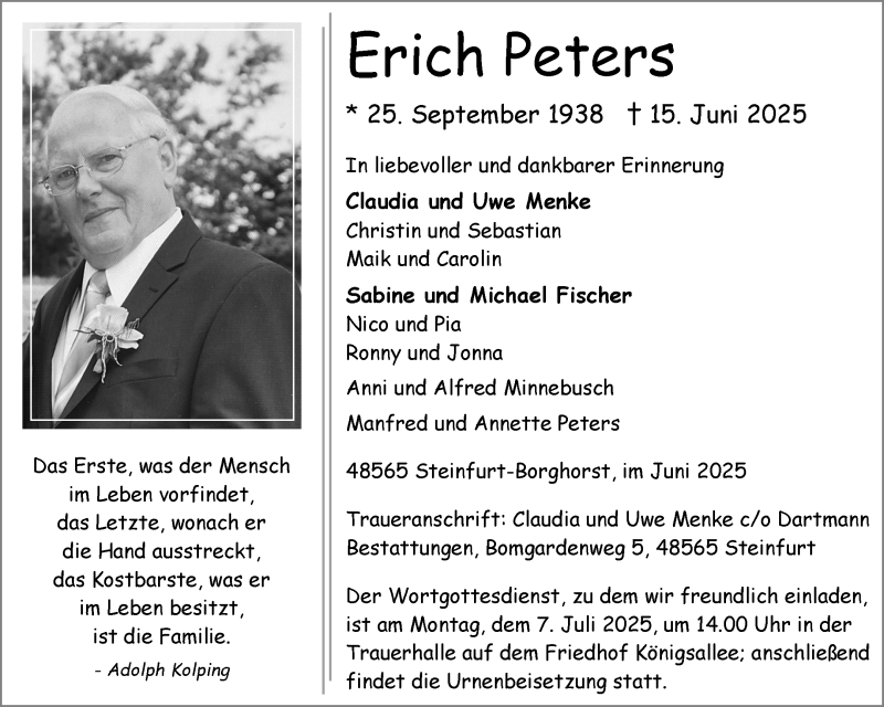 Hier finden Sie alle Traueranzeigen aus der Zeitung, die bisher für Erich Peters erschienen sind. Weitere Traueranzeigen, die in der Zeitung erscheinen, werden hier ebenfalls aufgelistet