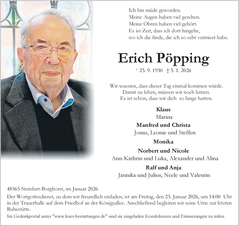 Hier finden Sie alle Traueranzeigen aus der Zeitung, die bisher für Erich Pöpping erschienen sind. Weitere Traueranzeigen, die in der Zeitung erscheinen, werden hier ebenfalls aufgelistet