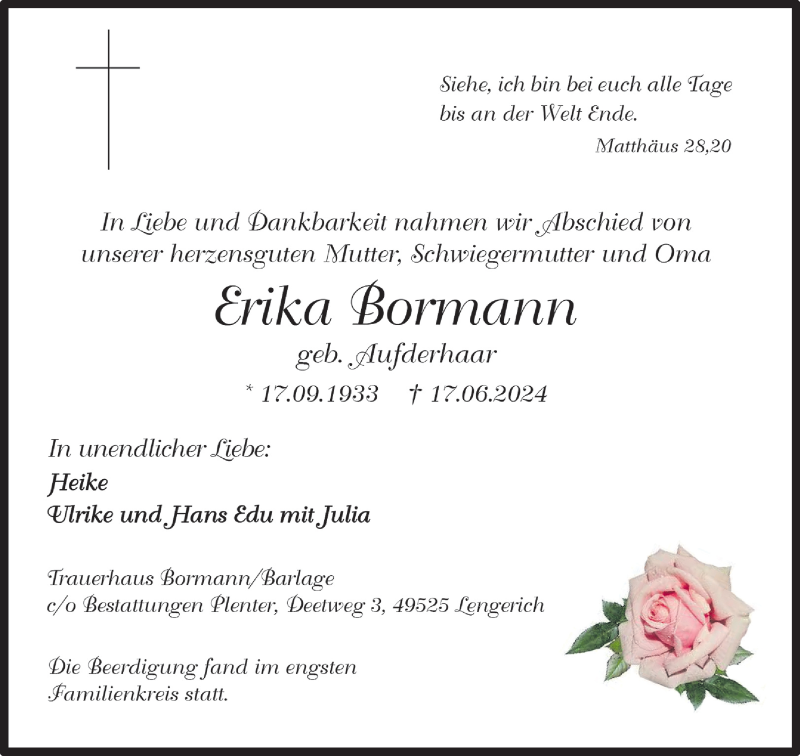 Hier finden Sie alle Traueranzeigen aus der Zeitung, die bisher für Erika Bormann erschienen sind. Weitere Traueranzeigen, die in der Zeitung erscheinen, werden hier ebenfalls aufgelistet