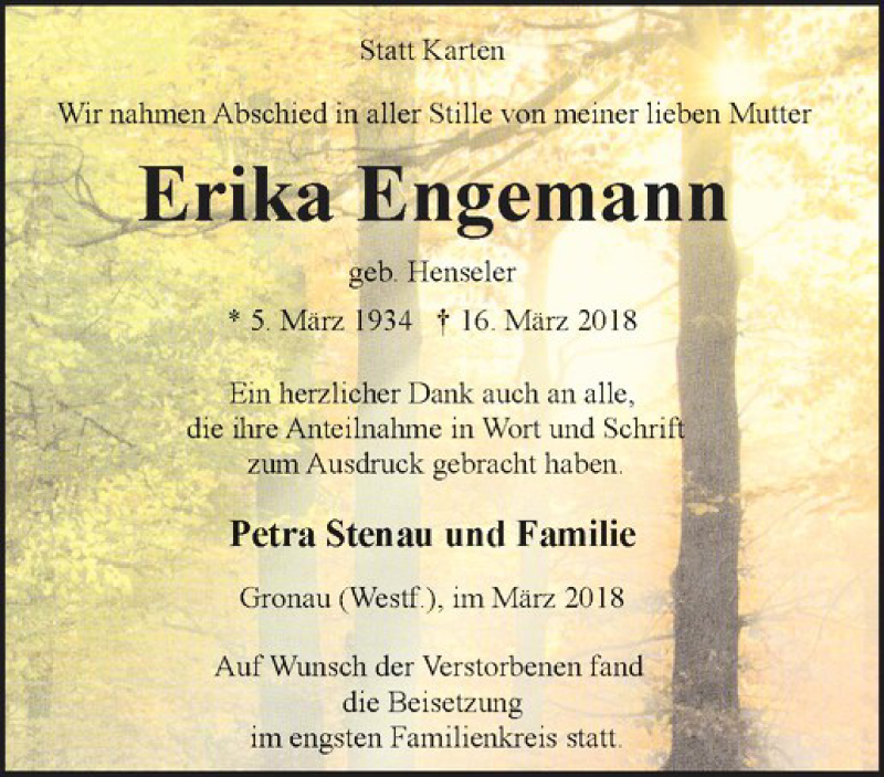 Hier finden Sie alle Traueranzeigen aus der Zeitung, die bisher für Erika Engemann erschienen sind. Weitere Traueranzeigen, die in der Zeitung erscheinen, werden hier ebenfalls aufgelistet