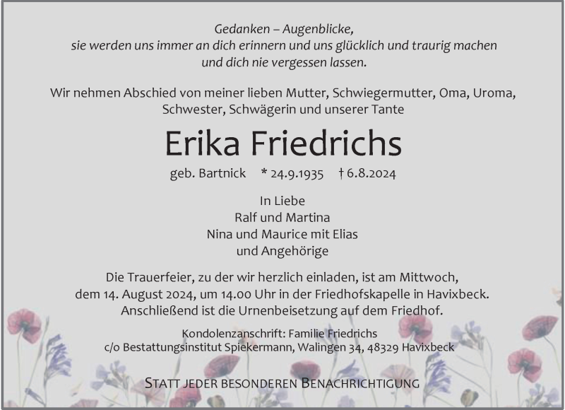 Hier finden Sie alle Traueranzeigen aus der Zeitung, die bisher für Erika Friedrichs erschienen sind. Weitere Traueranzeigen, die in der Zeitung erscheinen, werden hier ebenfalls aufgelistet