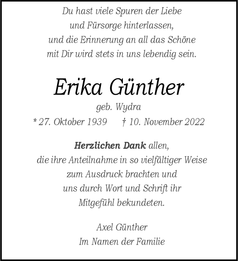 Hier finden Sie alle Traueranzeigen aus der Zeitung, die bisher für Erika Günther erschienen sind. Weitere Traueranzeigen, die in der Zeitung erscheinen, werden hier ebenfalls aufgelistet