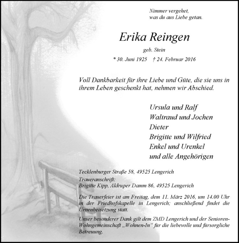 Hier finden Sie alle Traueranzeigen aus der Zeitung, die bisher für Erika Reingen erschienen sind. Weitere Traueranzeigen, die in der Zeitung erscheinen, werden hier ebenfalls aufgelistet