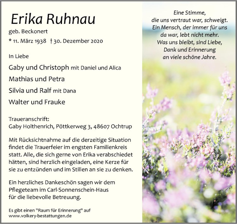 Hier finden Sie alle Traueranzeigen aus der Zeitung, die bisher für Erika Ruhnau erschienen sind. Weitere Traueranzeigen, die in der Zeitung erscheinen, werden hier ebenfalls aufgelistet