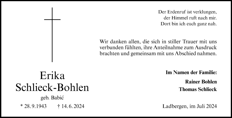 Hier finden Sie alle Traueranzeigen aus der Zeitung, die bisher für Erika Schlieck-Bohlen erschienen sind. Weitere Traueranzeigen, die in der Zeitung erscheinen, werden hier ebenfalls aufgelistet