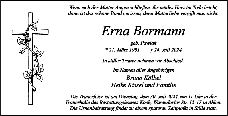 Hier finden Sie alle Traueranzeigen aus der Zeitung, die bisher für Erna Bormann erschienen sind. Weitere Traueranzeigen, die in der Zeitung erscheinen, werden hier ebenfalls aufgelistet