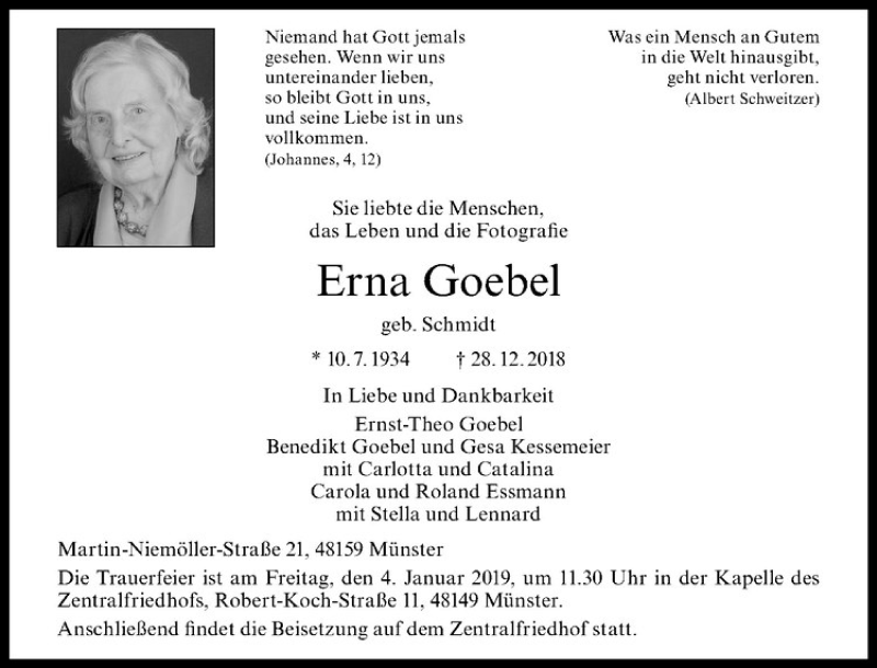 Hier finden Sie alle Traueranzeigen aus der Zeitung, die bisher für Erna Goebel erschienen sind. Weitere Traueranzeigen, die in der Zeitung erscheinen, werden hier ebenfalls aufgelistet