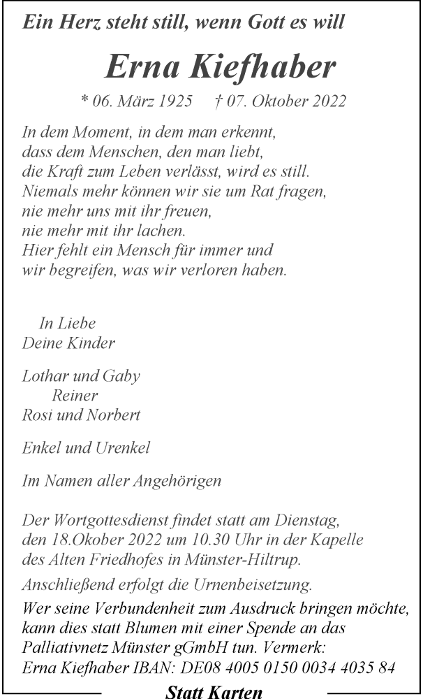 Hier finden Sie alle Traueranzeigen aus der Zeitung, die bisher für Erna Kiefhaber erschienen sind. Weitere Traueranzeigen, die in der Zeitung erscheinen, werden hier ebenfalls aufgelistet