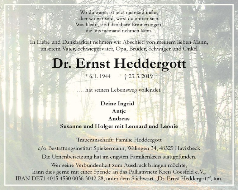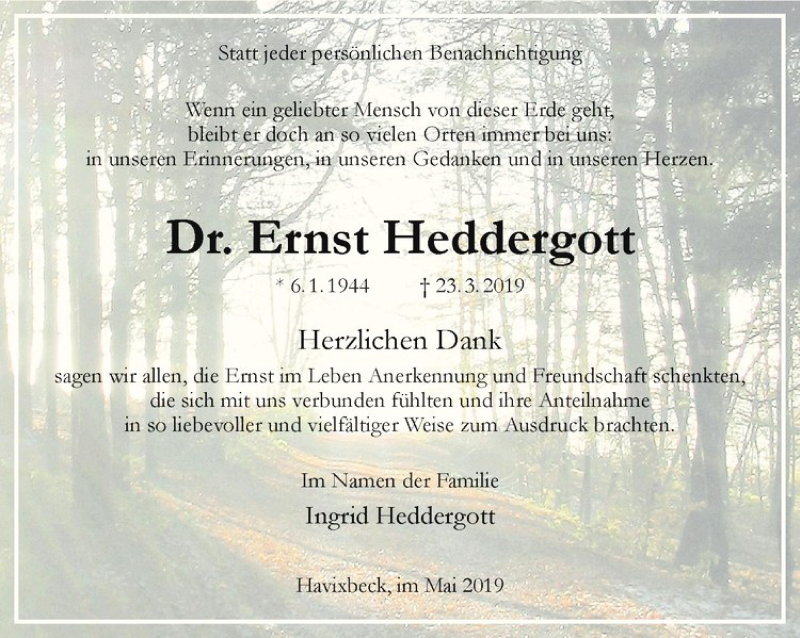 Hier finden Sie alle Traueranzeigen aus der Zeitung, die bisher für Ernst Heddergott erschienen sind. Weitere Traueranzeigen, die in der Zeitung erscheinen, werden hier ebenfalls aufgelistet