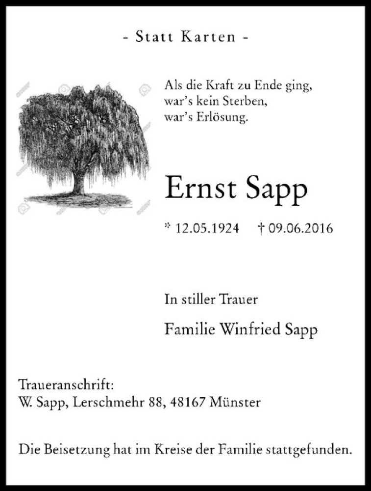 Hier finden Sie alle Traueranzeigen aus der Zeitung, die bisher für Ernst Sapp erschienen sind. Weitere Traueranzeigen, die in der Zeitung erscheinen, werden hier ebenfalls aufgelistet