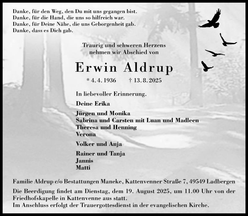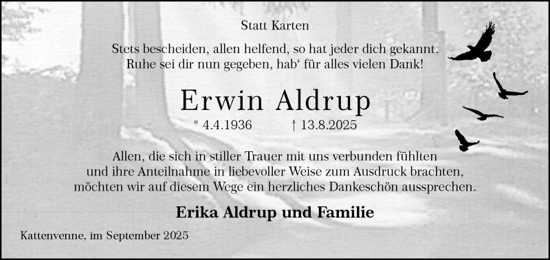 Hier finden Sie alle Traueranzeigen aus der Zeitung, die bisher für Erwin Aldrup erschienen sind. Weitere Traueranzeigen, die in der Zeitung erscheinen, werden hier ebenfalls aufgelistet