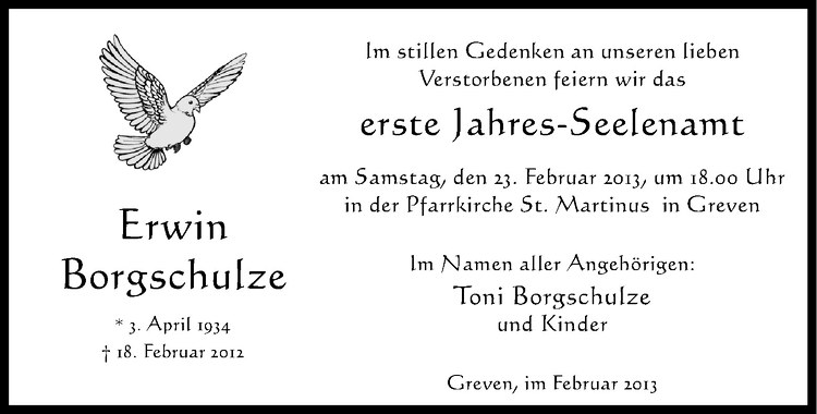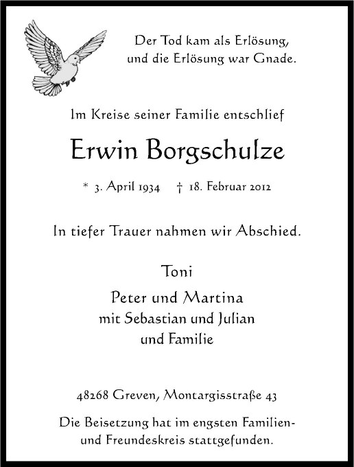 Hier finden Sie alle Traueranzeigen aus der Zeitung, die bisher für Erwin Borgschulze erschienen sind. Weitere Traueranzeigen, die in der Zeitung erscheinen, werden hier ebenfalls aufgelistet