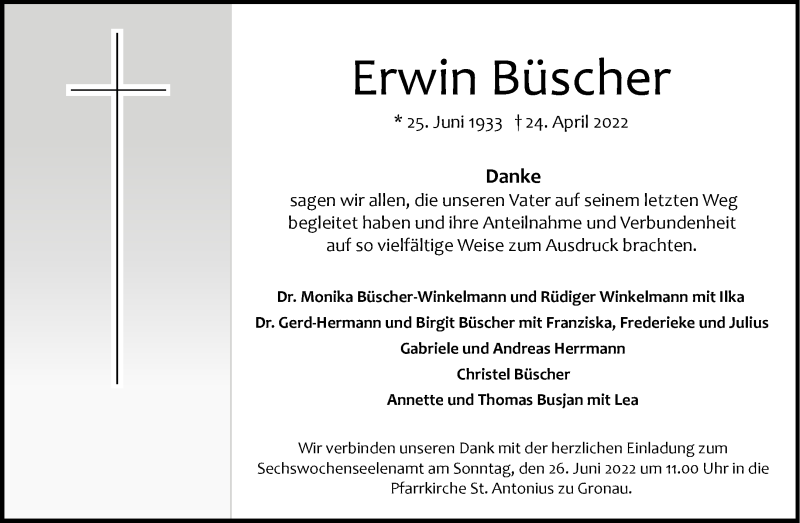 Hier finden Sie alle Traueranzeigen aus der Zeitung, die bisher für Erwin Büscher erschienen sind. Weitere Traueranzeigen, die in der Zeitung erscheinen, werden hier ebenfalls aufgelistet