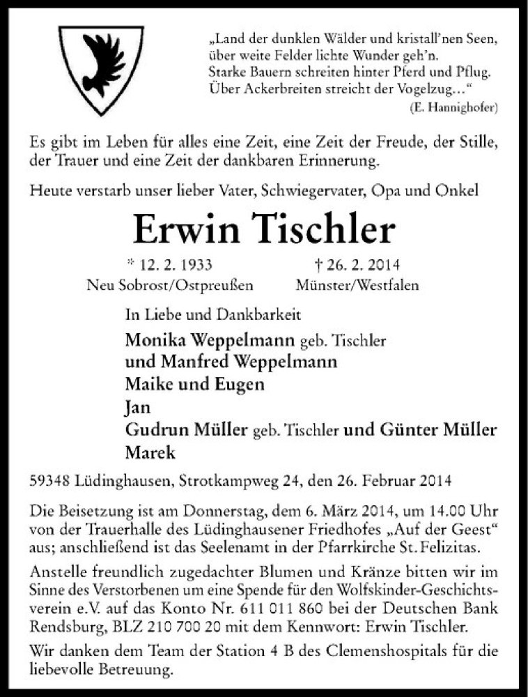 Hier finden Sie alle Traueranzeigen aus der Zeitung, die bisher für Erwin Tischler erschienen sind. Weitere Traueranzeigen, die in der Zeitung erscheinen, werden hier ebenfalls aufgelistet