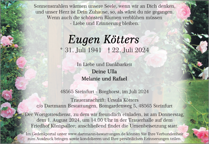 Hier finden Sie alle Traueranzeigen aus der Zeitung, die bisher für Eugen Kötters erschienen sind. Weitere Traueranzeigen, die in der Zeitung erscheinen, werden hier ebenfalls aufgelistet
