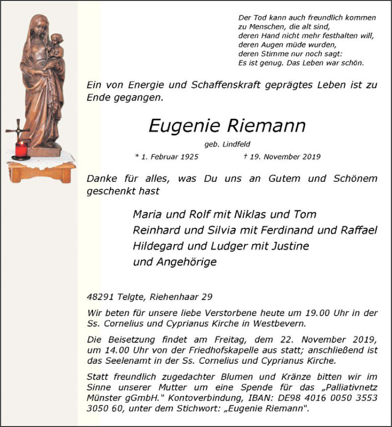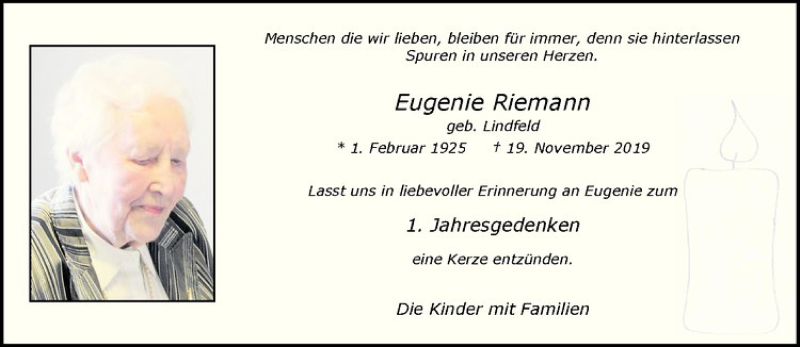 Hier finden Sie alle Traueranzeigen aus der Zeitung, die bisher für Eugenie Riemann erschienen sind. Weitere Traueranzeigen, die in der Zeitung erscheinen, werden hier ebenfalls aufgelistet