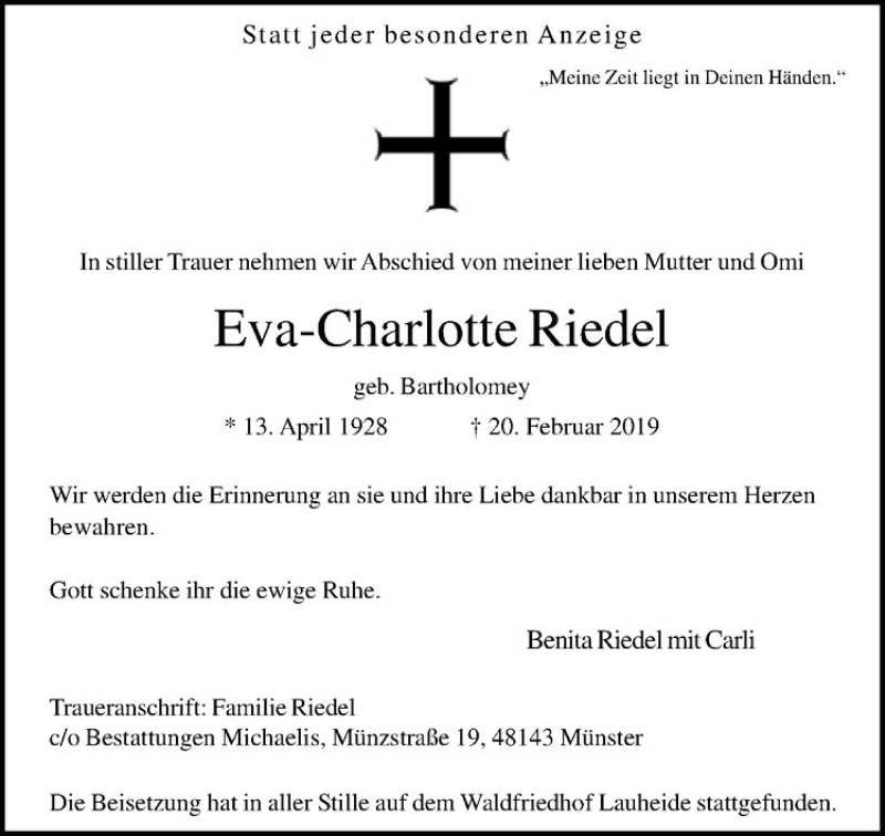 Hier finden Sie alle Traueranzeigen aus der Zeitung, die bisher für Eva-Charlotte Riedel erschienen sind. Weitere Traueranzeigen, die in der Zeitung erscheinen, werden hier ebenfalls aufgelistet