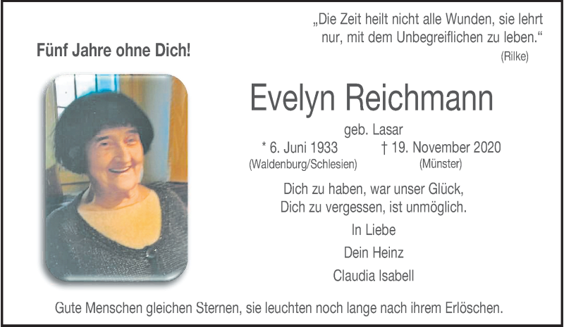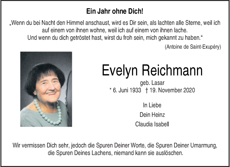 Hier finden Sie alle Traueranzeigen aus der Zeitung, die bisher für Evelyn Reichmann erschienen sind. Weitere Traueranzeigen, die in der Zeitung erscheinen, werden hier ebenfalls aufgelistet