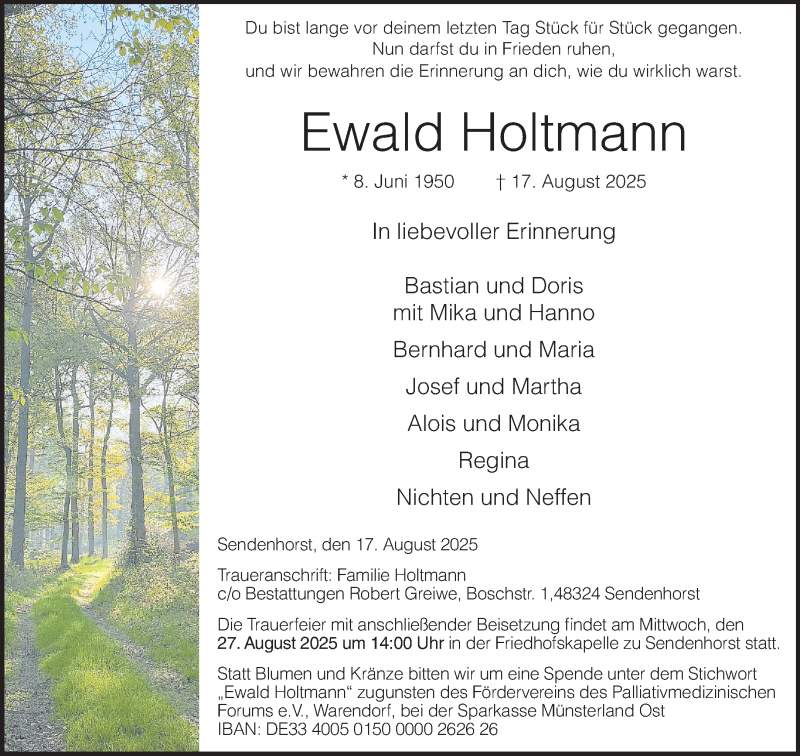 Hier finden Sie alle Traueranzeigen aus der Zeitung, die bisher für Ewald Holtmann erschienen sind. Weitere Traueranzeigen, die in der Zeitung erscheinen, werden hier ebenfalls aufgelistet