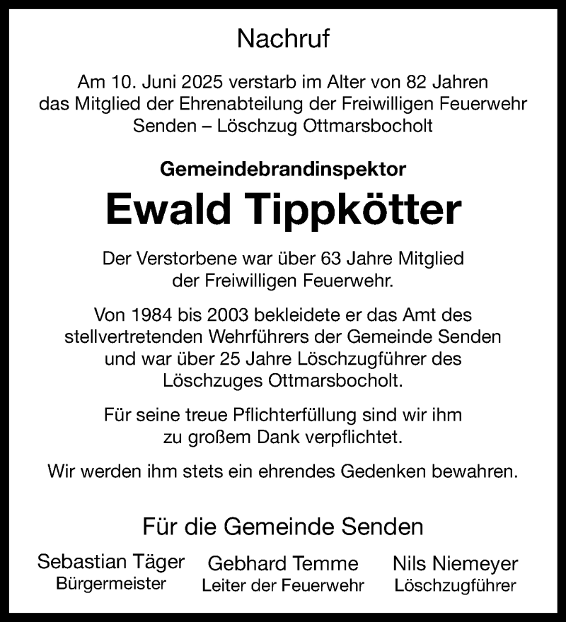 Hier finden Sie alle Traueranzeigen aus der Zeitung, die bisher für Ewald Tippkötter erschienen sind. Weitere Traueranzeigen, die in der Zeitung erscheinen, werden hier ebenfalls aufgelistet