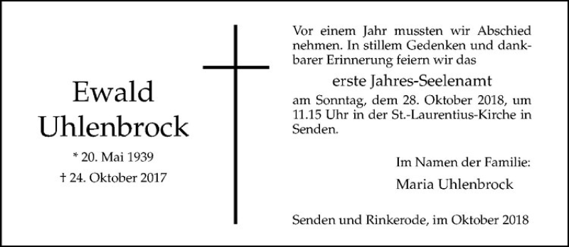 Hier finden Sie alle Traueranzeigen aus der Zeitung, die bisher für Ewald Uhlenbrock erschienen sind. Weitere Traueranzeigen, die in der Zeitung erscheinen, werden hier ebenfalls aufgelistet