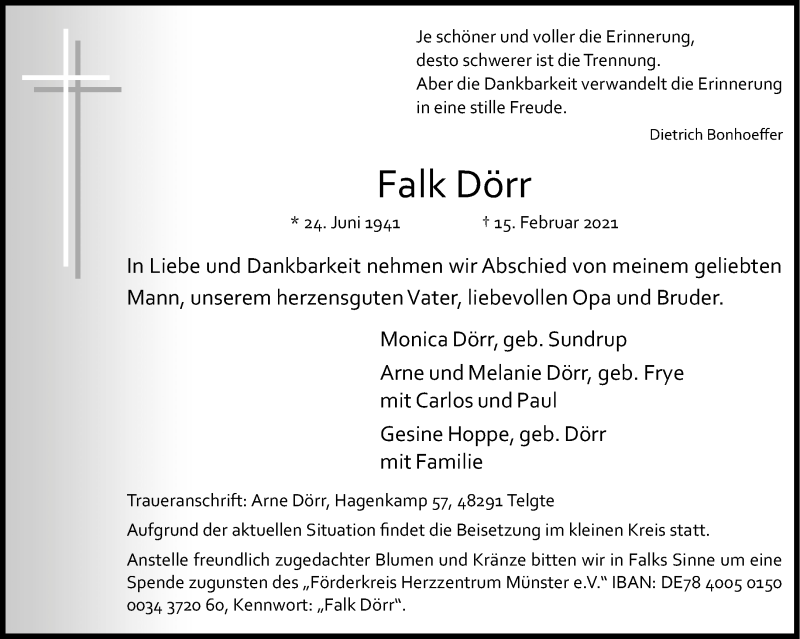 Hier finden Sie alle Traueranzeigen aus der Zeitung, die bisher für Falk Dörr erschienen sind. Weitere Traueranzeigen, die in der Zeitung erscheinen, werden hier ebenfalls aufgelistet
