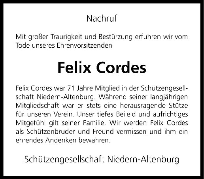 Hier finden Sie alle Traueranzeigen aus der Zeitung, die bisher für Felix Cordes erschienen sind. Weitere Traueranzeigen, die in der Zeitung erscheinen, werden hier ebenfalls aufgelistet