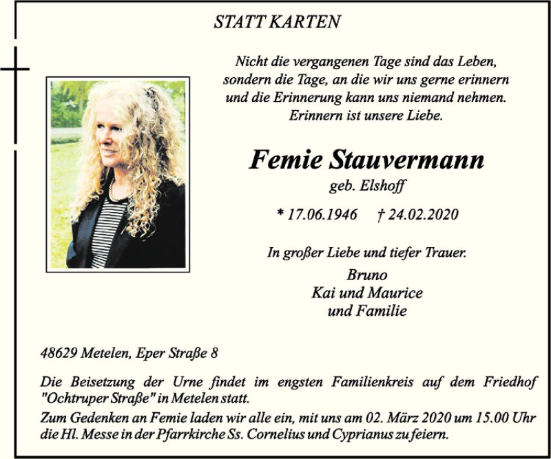 Hier finden Sie alle Traueranzeigen aus der Zeitung, die bisher für Femie Stauvermann erschienen sind. Weitere Traueranzeigen, die in der Zeitung erscheinen, werden hier ebenfalls aufgelistet