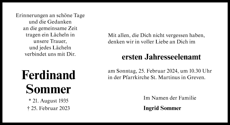Hier finden Sie alle Traueranzeigen aus der Zeitung, die bisher für Ferdinand Sommer erschienen sind. Weitere Traueranzeigen, die in der Zeitung erscheinen, werden hier ebenfalls aufgelistet