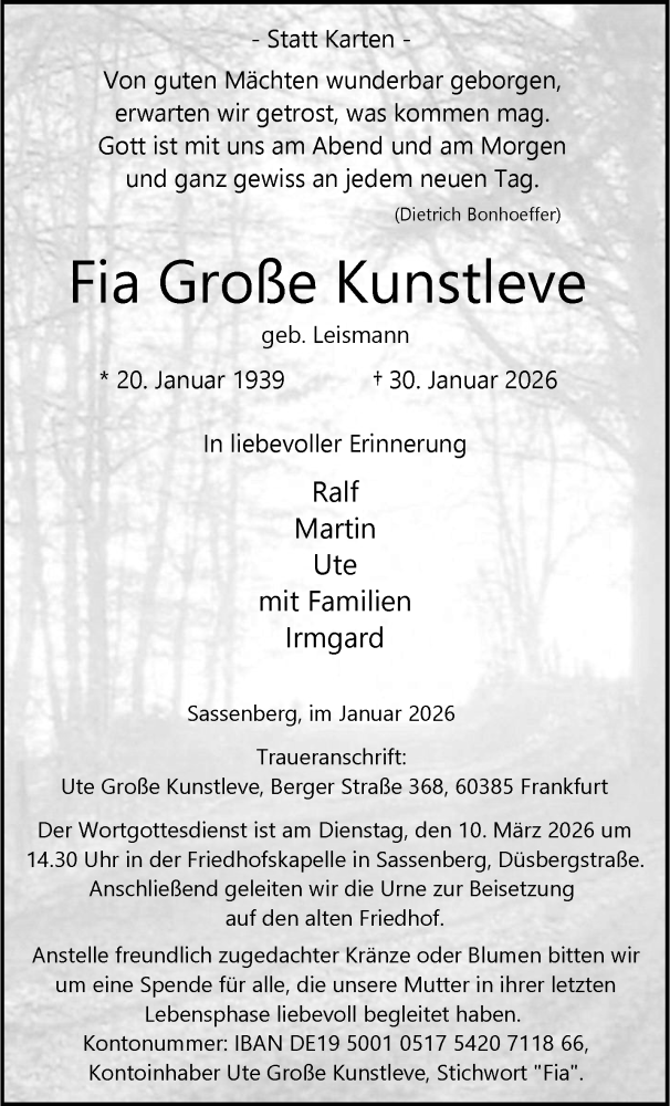 Hier finden Sie alle Traueranzeigen aus der Zeitung, die bisher für Fia Große Kunstleve erschienen sind. Weitere Traueranzeigen, die in der Zeitung erscheinen, werden hier ebenfalls aufgelistet