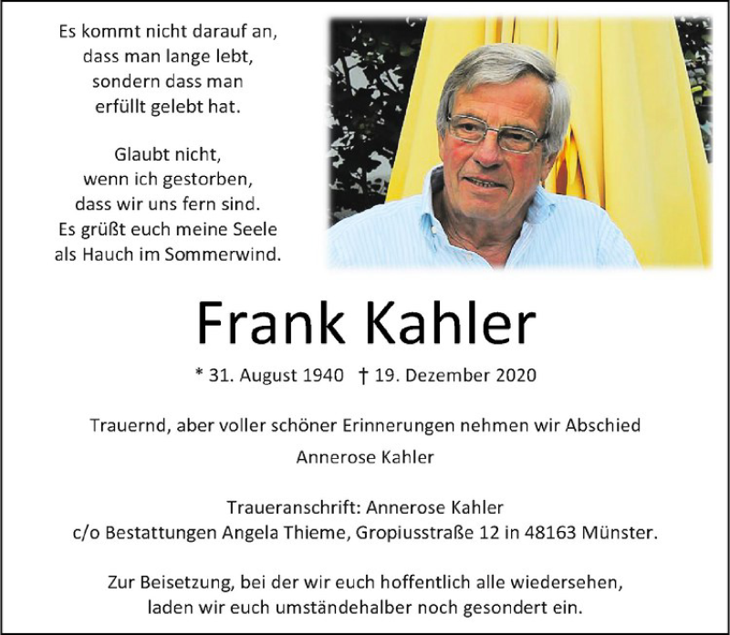 Hier finden Sie alle Traueranzeigen aus der Zeitung, die bisher für Frank Kahler erschienen sind. Weitere Traueranzeigen, die in der Zeitung erscheinen, werden hier ebenfalls aufgelistet