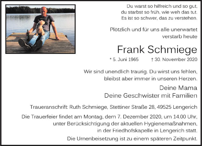 Hier finden Sie alle Traueranzeigen aus der Zeitung, die bisher für Frank Schmiege erschienen sind. Weitere Traueranzeigen, die in der Zeitung erscheinen, werden hier ebenfalls aufgelistet
